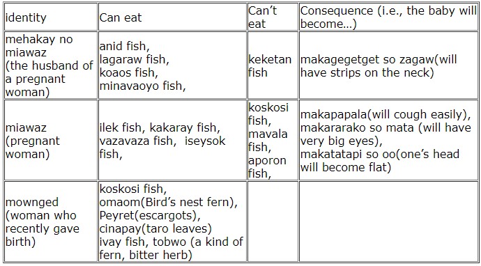 Students match fish names with (a) the identity of the person who eats them and (b) the traditional consequences of eating them. They discuss whether it is culturally appropriate for each identity group (pregnant woman, husband, postpartum woman) to eat each type of fish.