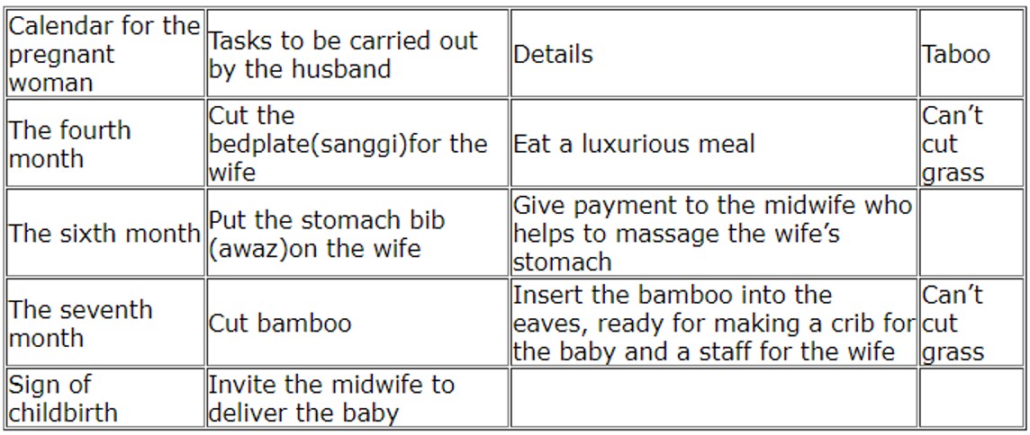 Students create a calendar marking the important months during which required rituals must be carried out by the pregnant woman's husband. Tasks include preparing the stomach bib, cutting bamboo, making the baby crib, and preparing ritual offerings.